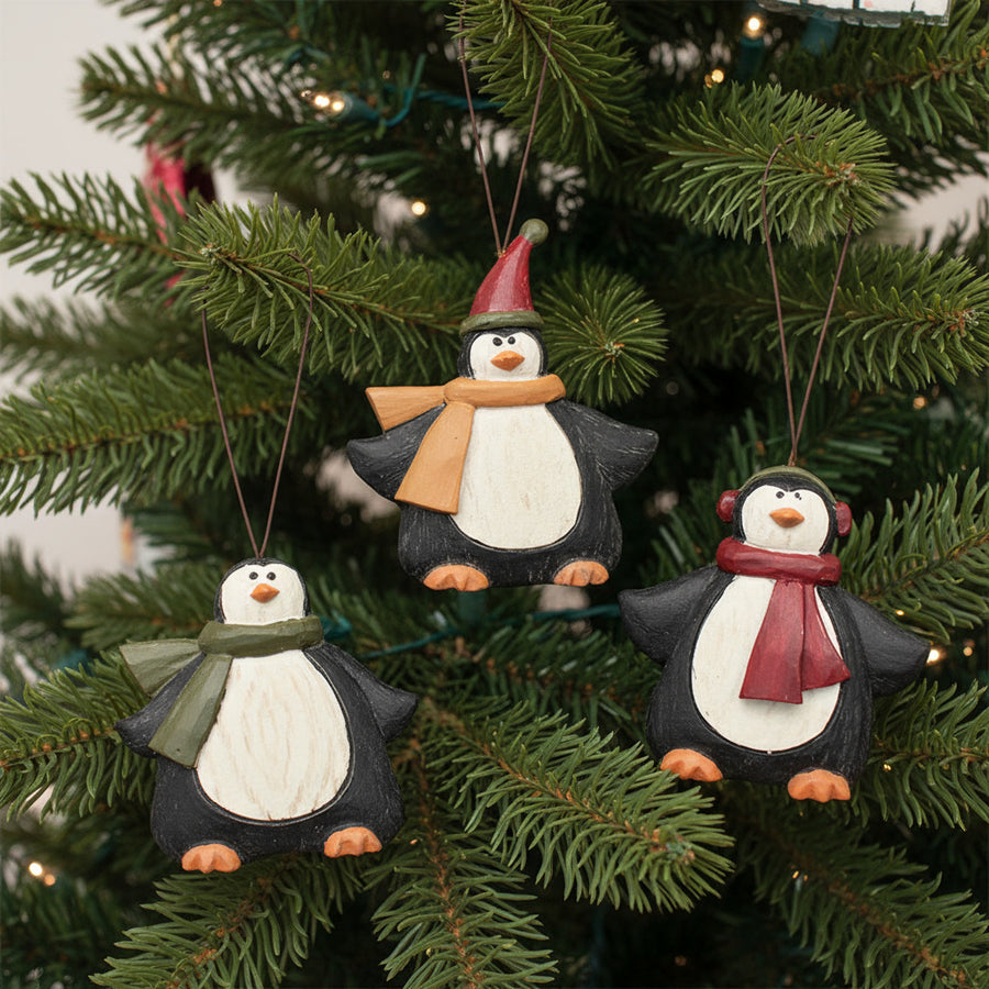 Dressed in coordinated hats and scarves, this trio of adorable, flat-backed penguin ornaments are sure to bring a bit of arctic charm to your holiday celebrations.