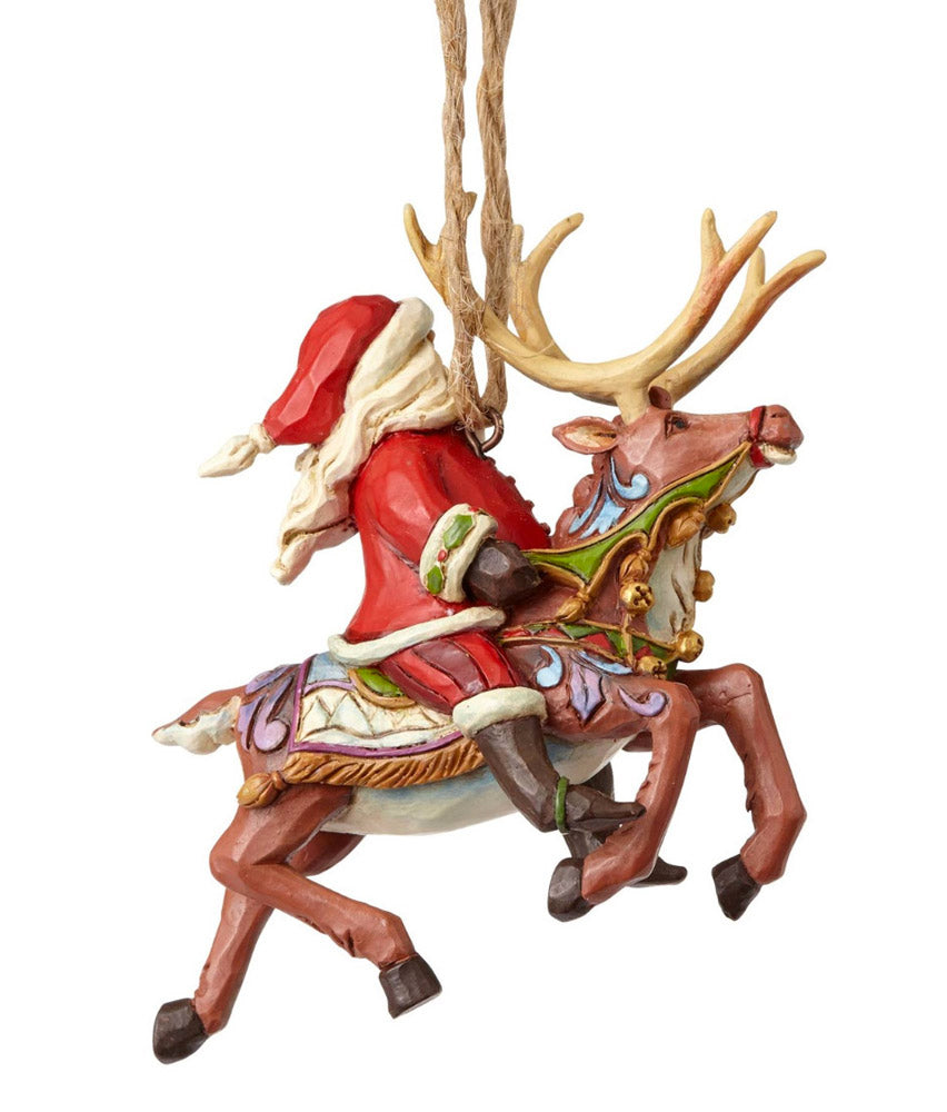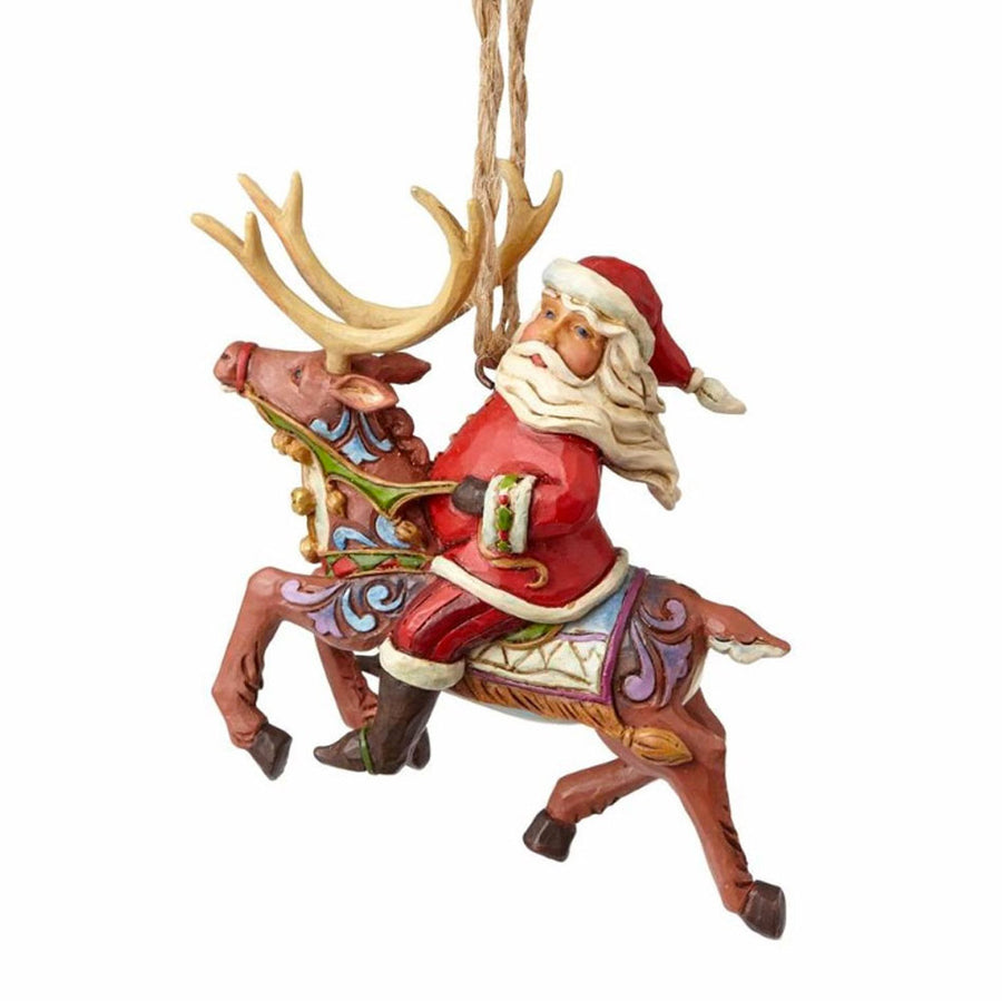 Santa surveys the North Pole on the back of a beautifully decorated Christmas reindeer in this festive holiday sculpture. Ready to hang, this ornament makes a delightful addition to your Jim Shore collection and holiday decor.